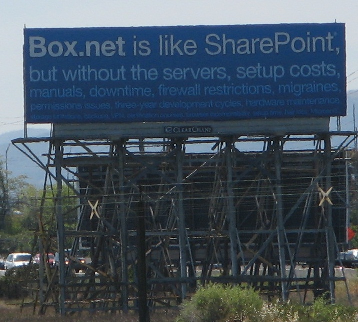 Box.net is like SharePoint but without the hassles, announces a billboard on U.S. Route 101 as it runs by Redwood Shores in Silicon Valley. The Box.net web site boasts of unleashing a SharePoint killer, a white knight in the cloud destined to slay the on-premise dragon from Redmond.